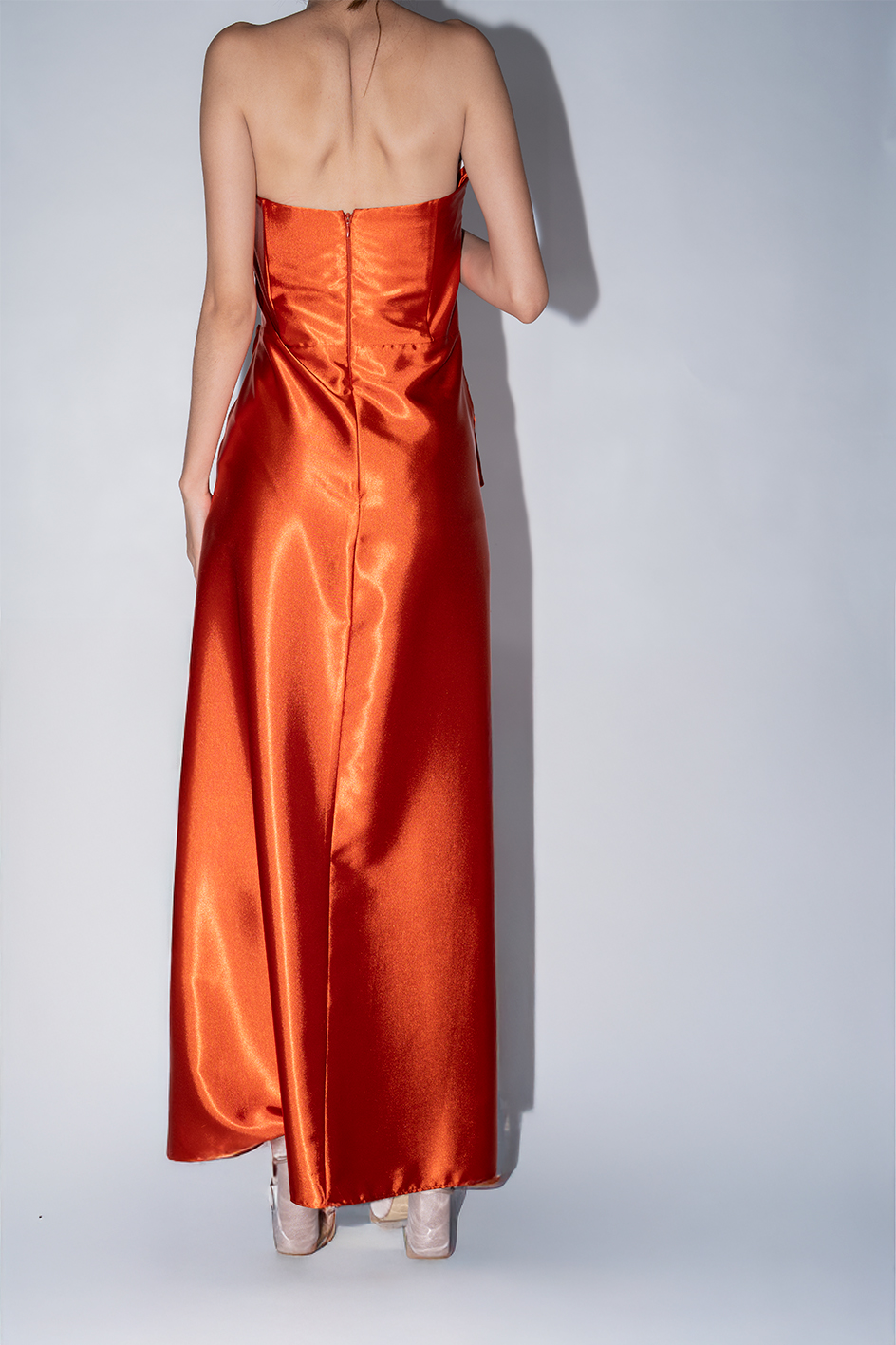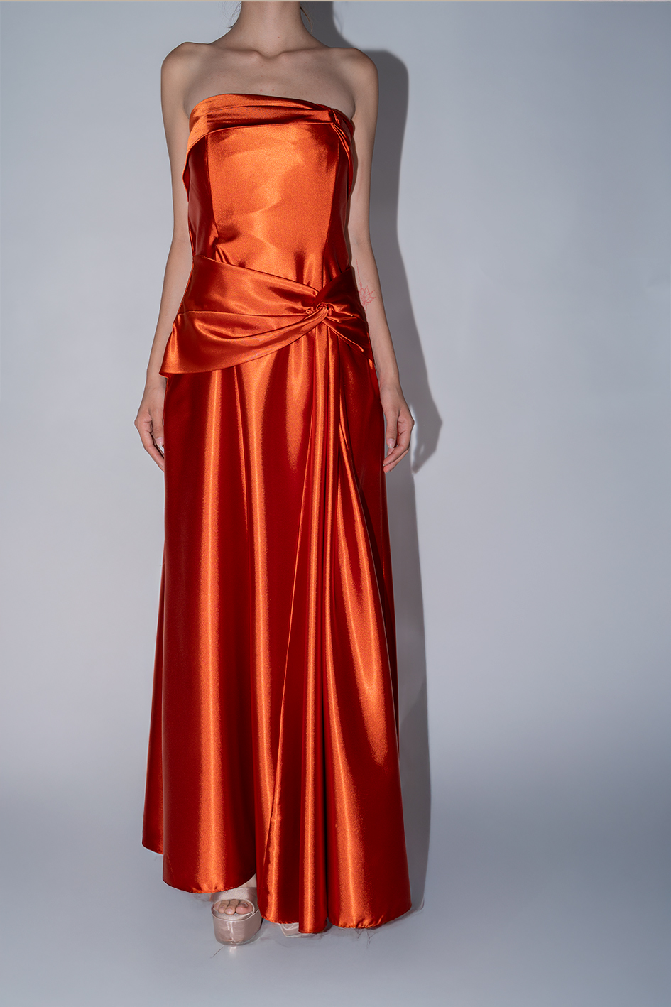 Vestido talla «M», color terracota, strapless, tela sedosa, con decoración de telas en zona de la cintura y sin copas.