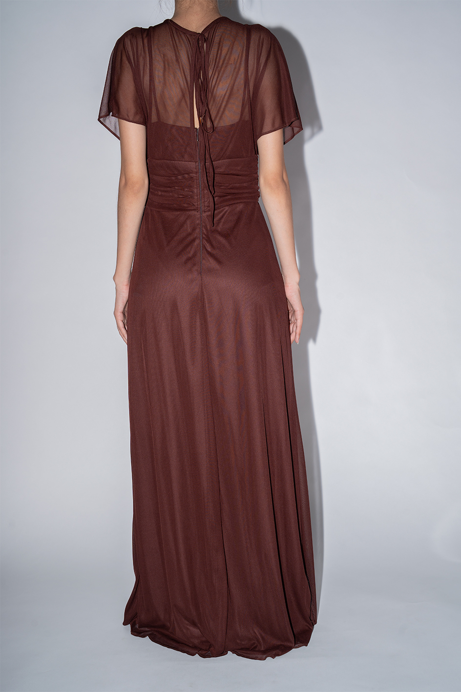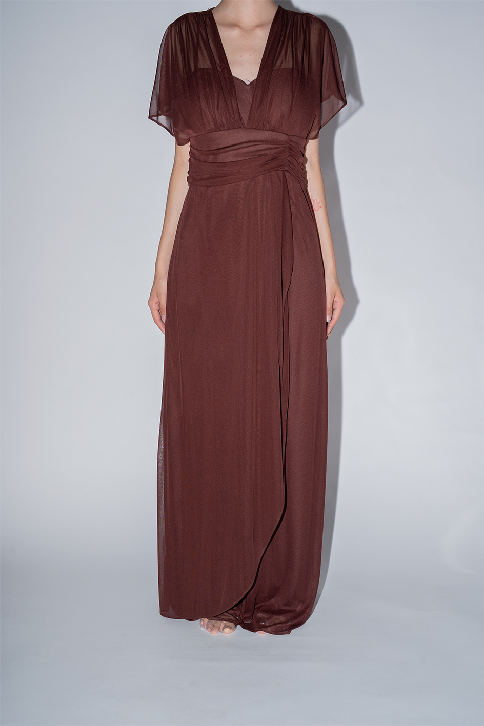 Vestido en talla «S», color café oscuro, escote en «V»; mangas transparentes y holgadas, con copa y listón ajustable en zona de la espalda.