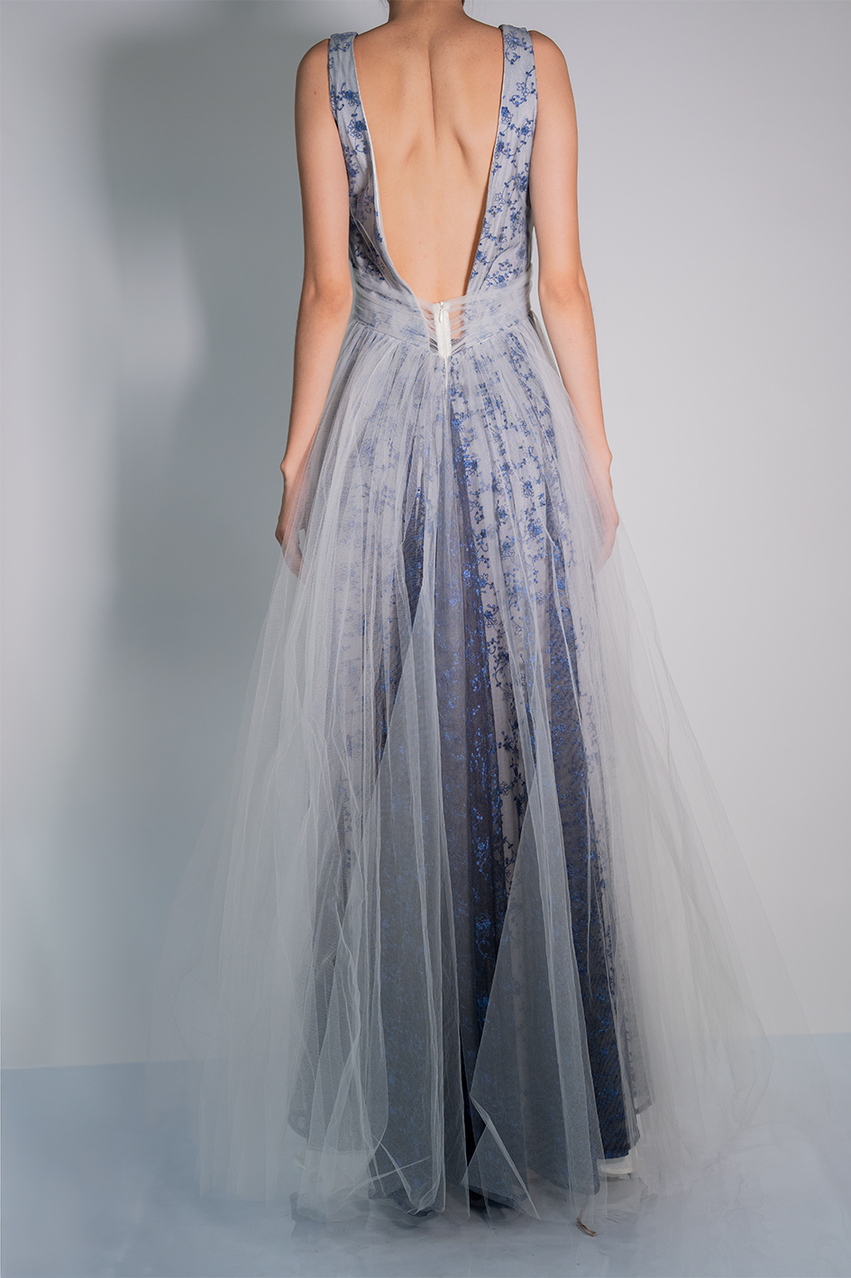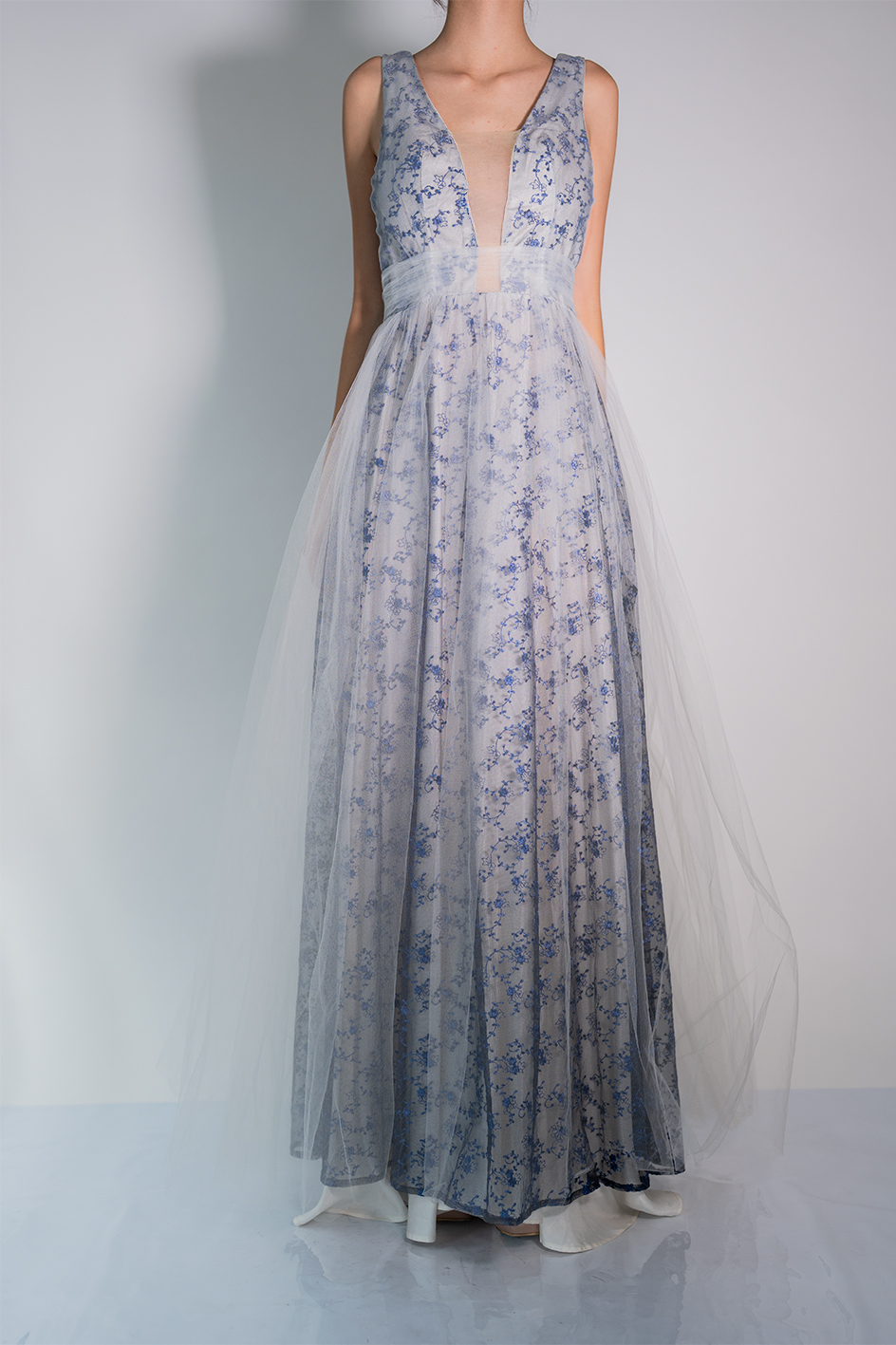 Vestido en talla «M»,color blanco con encaje de flores azules, cubierto por un tul negro en zona interna, escote en «V» en zona frontal y trasera, y tul blanco en zona externa y alrededor de la cintura.