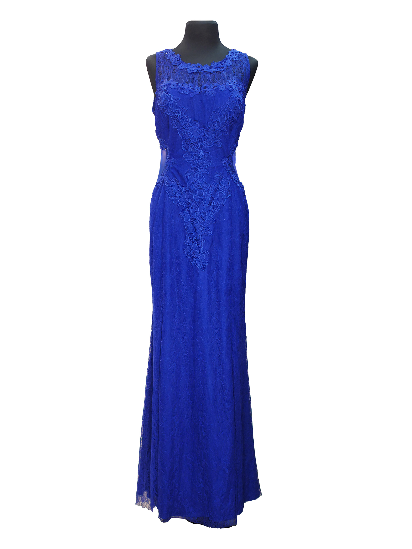 Vestido talla «L», color azul rey, cuello en «V» y escote amplio en espalda, con copas y encaje, transaprencias en zonas de la cintura.