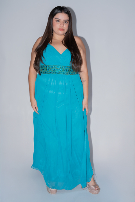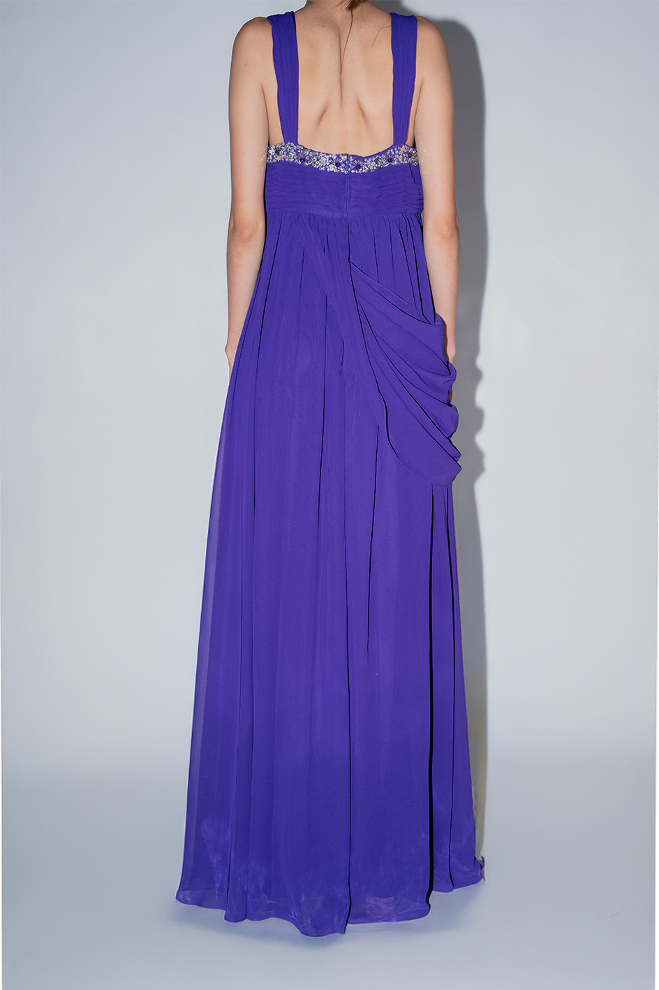 Vestido talla «M», color morado, con copas , decoración de pedrería en zona superior, y caída de tela en lado izquierdo.