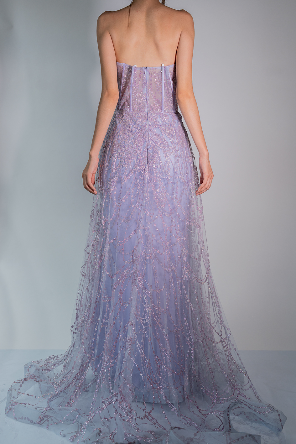 Vestido en talla «M», color lila, strapless, tul en parte inferior, corsé en parte superior, con brillos y con cola en parte trasera.