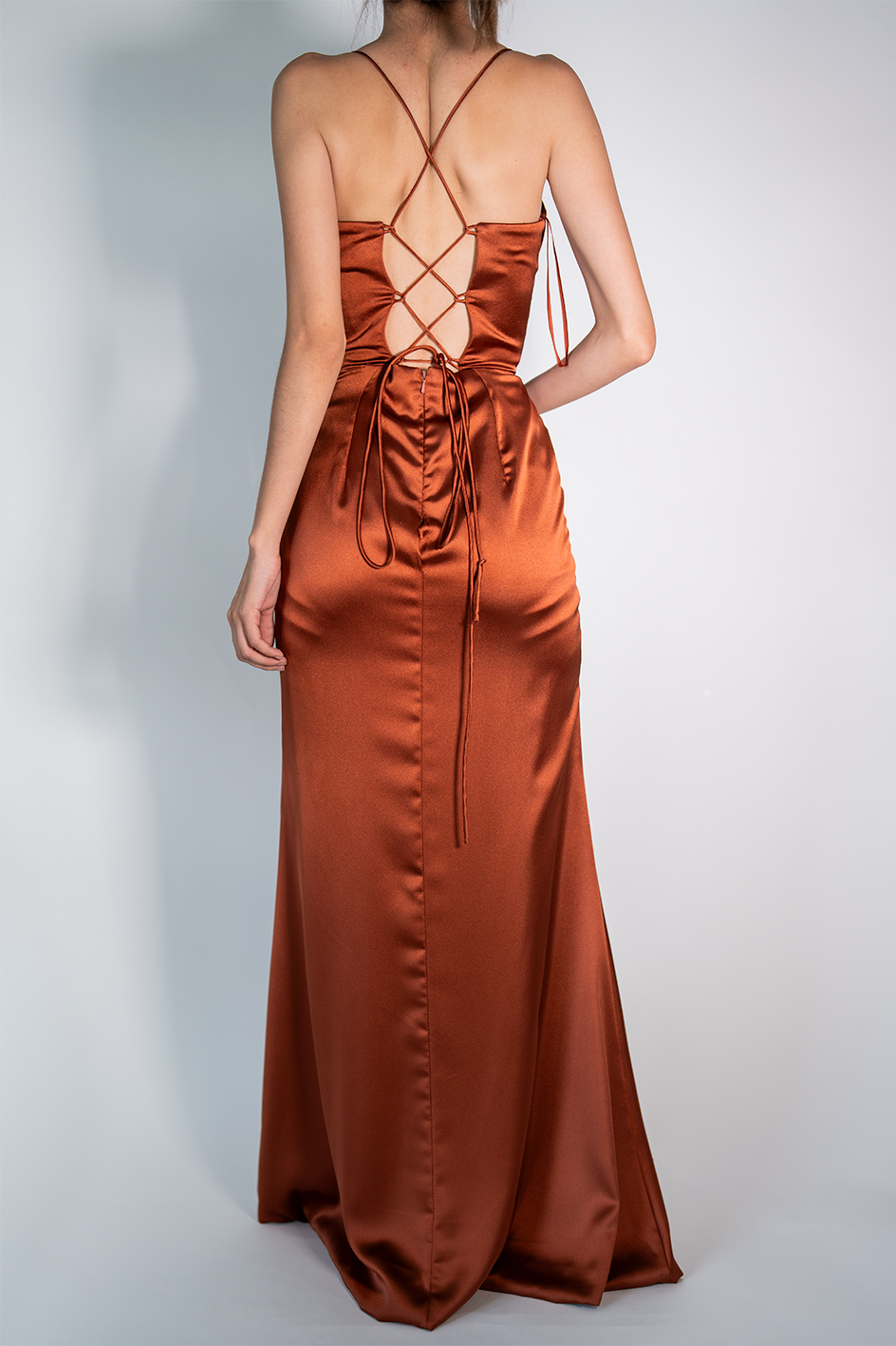 Vestido talla «M» en color terracota, strapless, con abertura en pierna izquierda, varillas en parte superior y listones ajustables en parte trasera.