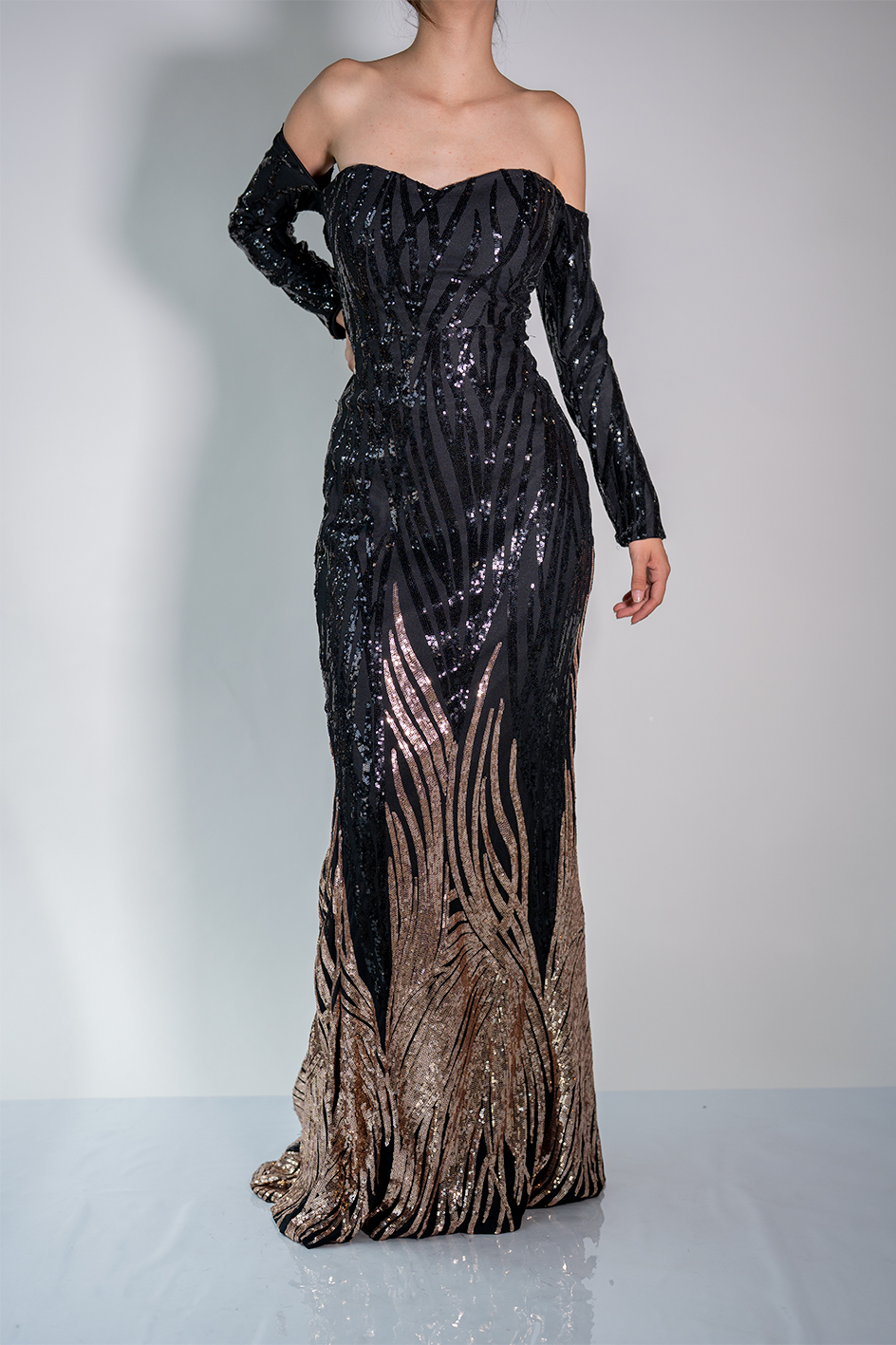 Vestido color negro, con lentejuelas de mangas largas, ajustado al cuerpo, con detalle en pierna color dorado.